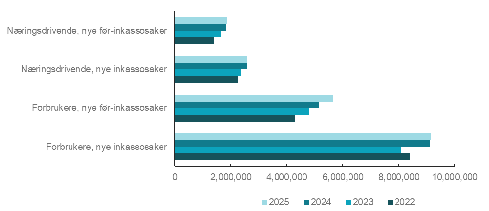 Antallet nye inkassosaker og nye før-inkassosaker i 2025 viste en økning på henholdsvis 0,3 og 7,8 prosent sammenlignet med 2024. Antallet nye inkassosaker og før-inkassosaker overfor henholdsvis forbrukere og næringsdrivende for perioden 2022-2025 framgår i figur 1.