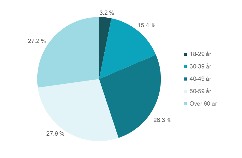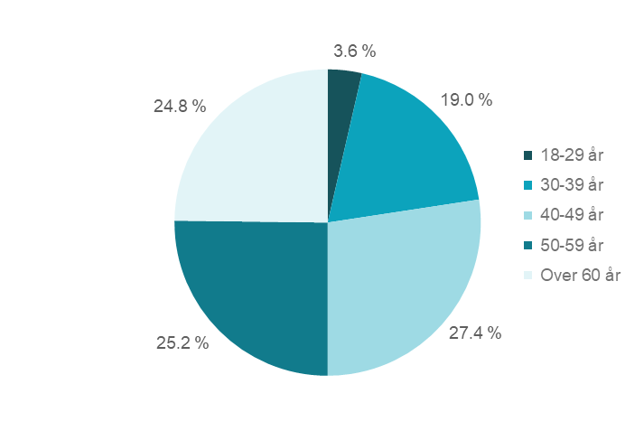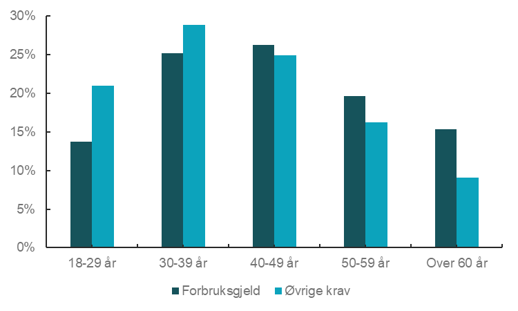 Aldersgruppen 40–49 år hadde høyest andel av misligholdt forbruksgjeld med 27,4 prosent, mens aldersgruppen 18–29 år hadde lavest andel med 3,6 prosent, se figur 5 og tabell 4.1 og 4.2 i vedlegget.
