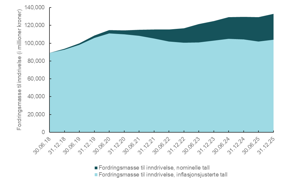 Samlet fordringsmasse til inndrivelse er summen av hovedstol (opprinnelig gjeld), renter og omkostninger for alle misligholdte krav som er til inndrivelse. Ved utgangen av 2025 var samlet fordringsmasse på 133,1 milliarder kroner, en nominell økning på 2,7 prosent sammenlignet med utgangen av 2024. Den inflasjonsjusterte endringen i samme periode var en nedgang på 0,4 prosent.