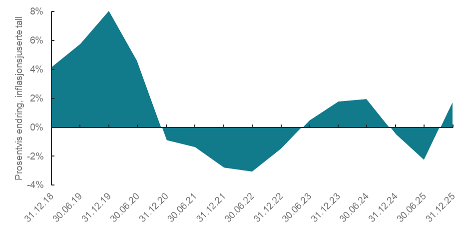 | Figur 3: Prosentvis endring for fordringsmasse til inndrivelse i inflasjonsjusterte tall for perioden 31.12.2018–31.12.2025 |