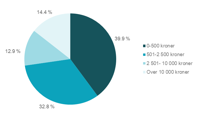Ved utgangen av 2025 var 39,9 prosent av inkassosakene overfor forbrukere krav hvor opprinnelig gjeld var på under 500 kroner. 72,7 prosent av inkassosakene overfor forbrukere var krav hvor opprinnelig gjeld var på under 2 500 kroner, se figur 4 og tabell 3.2 i vedlegget.