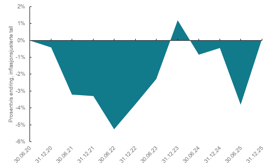 | Figur 7: Prosentvis endring for misligholdt hovedstol (opprinnelig gjeld) knyttet til forbruksgjeld i inflasjonsjusterte tall for perioden 30.06.2020–31.12.2025 |