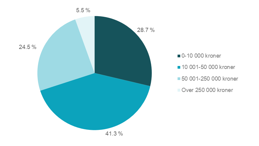 Misligholdt hovedstol knyttet til forbruksgjeld fordelt på beløpsstørrelser viste at 41,3 prosent av inkassosakene hadde hovedstol på mellom 10 001 og 50 000 kroner, se figur 8 og tabell 3.2 i vedlegget.